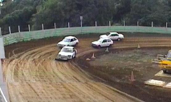 1本目の走行がスタートしましたが、前回とは全くμ(ミュー)が違う!かなり慎重に踏んでもブレーキはすぐロックするし、立ち上がりでもトラクションが全然懸かりません。(この時点ではAT車でかえってラッキーだったのですが)それに、バンクの一番下、即ちイン側のラインだとぬかって全然前に進まないのです。即ち、コーナーの入り口でインを取っても、出口で加速できず、結局アウトから抜き返されてしまうのです。この回は前回の走りの延長でセオリー通りに2台抜くことができました。